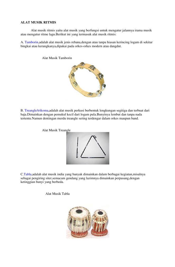 Beberapa contoh alat musik ini misalnya drum, marakas, simbal, tamborin, timpani, triangle, konga, timpani, kastanyet, rebana, tifa, dan kendang. Salah satu contoh alat musik ritmis modern yang sudah terkenal adalah tamborin. Beberapa contoh alat musik ini misalnya drum, marakas, simbol, tamborin, timpani, triangle, konga, timpani, kastanyet, rebana, tifa dan kendang. (sabda.org., 2009) 2 ibadah raya adalah ibadah yang diadakan pada hari minggu dan bersifat umum, ibadah raya Alat musik tamborin cara memainkannya dengan dipukul serta digoyangkan.